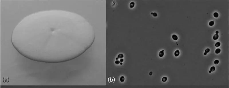 Morphology of Starmerella caucasica 11-1071.1T. (a) Colony morphology on YPGA after 1 month of incubation at 25oC. (b) Yeast cells in overnight culture growing in YPGL at 25oC. Scale bar is 5 μm.