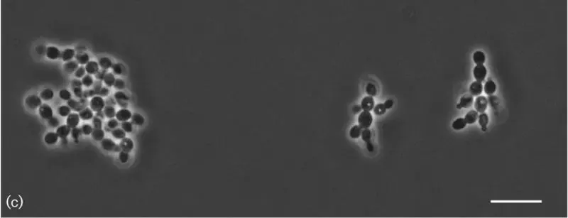 Morphology of strain 11-487T. (a) Colony morphology on YPGA after 1 month of incubation at 25 °C. (b) Cells in a 3-day culture growing in YPGL at 25 °C. (c) Cell groups and pseudohyphae-like cell chains in an overnight culture growing in YPGL at 25 °C. Bar, 10 μm.
